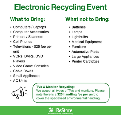 Celebrate Earth Day with us at the Phoenixville ReStore! In partnership with Junkluggers, we’re hosting our Annual Electronic Waste Recycling Event on Wednesday, April 22nd, from 10 AM to 12 PM. It’s the perfect opportunity to declutter those junk drawers and safely recycle your old cell phones, wires, TVs, and more.